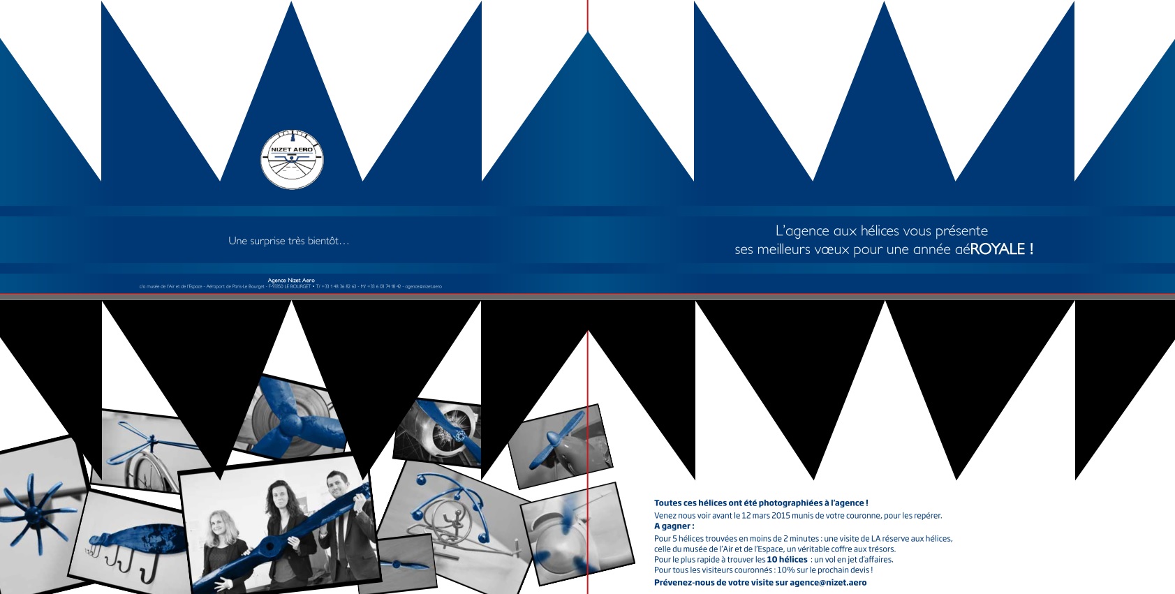 La carte de vœux de l’agence, en forme de couronne, souhaitait une année « aéROYALE ». Des photos, toutes prises dans nos bureaux, invitaient à retrouver dix hélices, le plus rapidement possible. Pour tenter sa chance, il fallait venir nous rendre visite avant le 12 mars, coiffé de sa couronne. Pour brouiller les pistes, les échelles des objets photographiés avaient été modifiées.