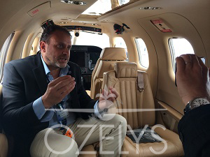 Notre « vigie », un endroit propice aux interviews tout en gardant un œil sur le salon. Ici, Laurent Détroyat, directeur commercial de LunaJets, avec la rédaction de Ultimate Jet.
