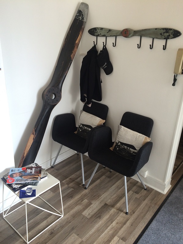 Cet appartement fut celui du gardien du musée, à l’époque où cette fonction n’était pas assurée par un service de gardiennage. De l’état d’habitation, nous l’avons transformé en bureaux et décoré sur les thèmes du voyage et de l’aviation. Des hélices (bien sûr), des instruments de bord, des valises, des globes terrestres, des morceaux d’avions en tout genre, une collection de thés, de maquettes et de photos vintage, c’est notre chez nous. Un repère où il fait bon travailler, l’oasis au milieu du tarmac, où aiment nous retrouver clients et amis pour sessions de travail et moments d’échange. La vue imprenable sur les pistes dévoile le tarmac du musée et celui de l’aviation d’affaires. Au loin, l’approche de Roissy.