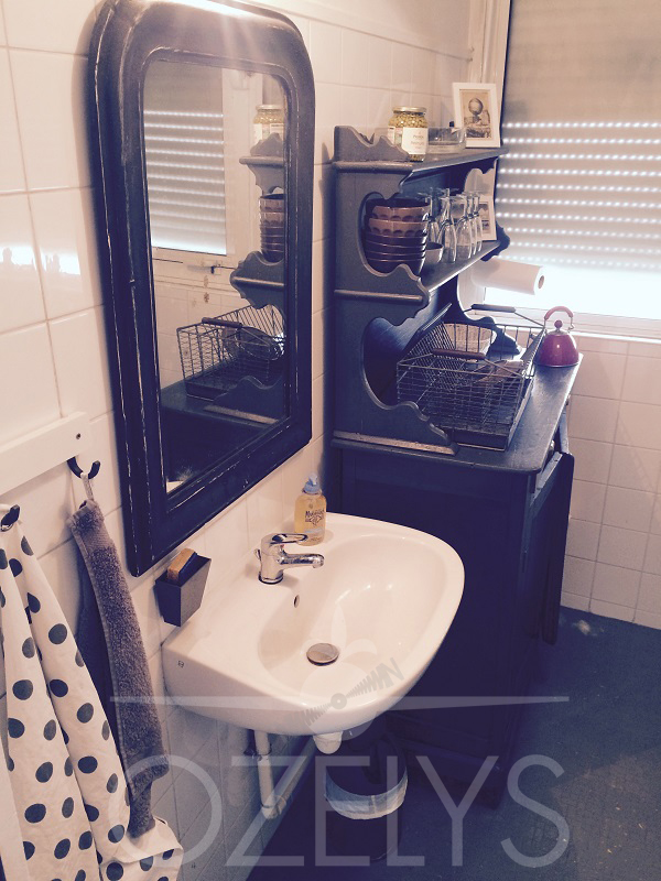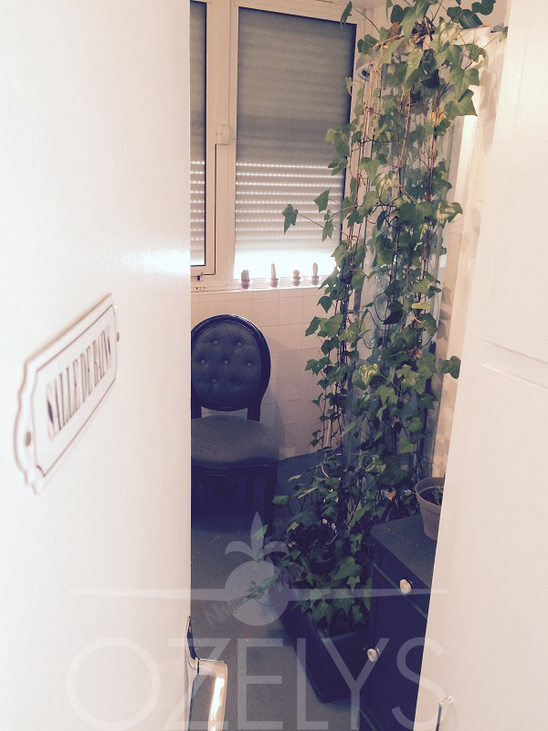 La salle de bain. Peu banal dans une entreprise nous direz-vous. C’est le seul élément de l’appartement qui a été conservé en l’état, hormis la peinture au sol couleur tarmac, à laquelle est assortie la décoration « shabby chic ». Un espace qui nous est bien utile pendant le Salon du Bourget par exemple. La douche est camouflée par du lierre qui se plaît bien là (ah oui, des plantes vertes, il y en a un peu partout).
