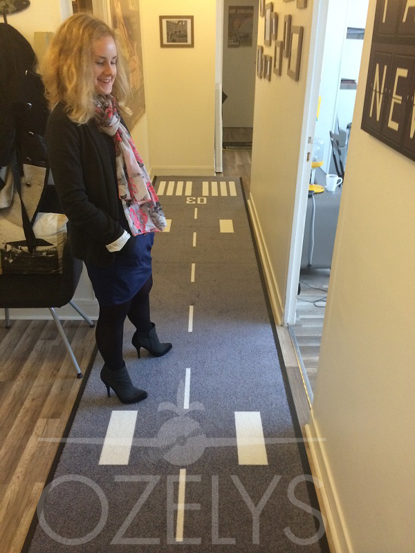 Le couloir qui desservait les pièces de l’appartement et qui mène désormais aux deux bureaux principaux. Le tapis fait sur mesure rappelle la piste mythique du Bourget, la 03-21. Au mur, des photos de l’aéroport à travers les âges.