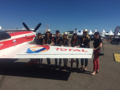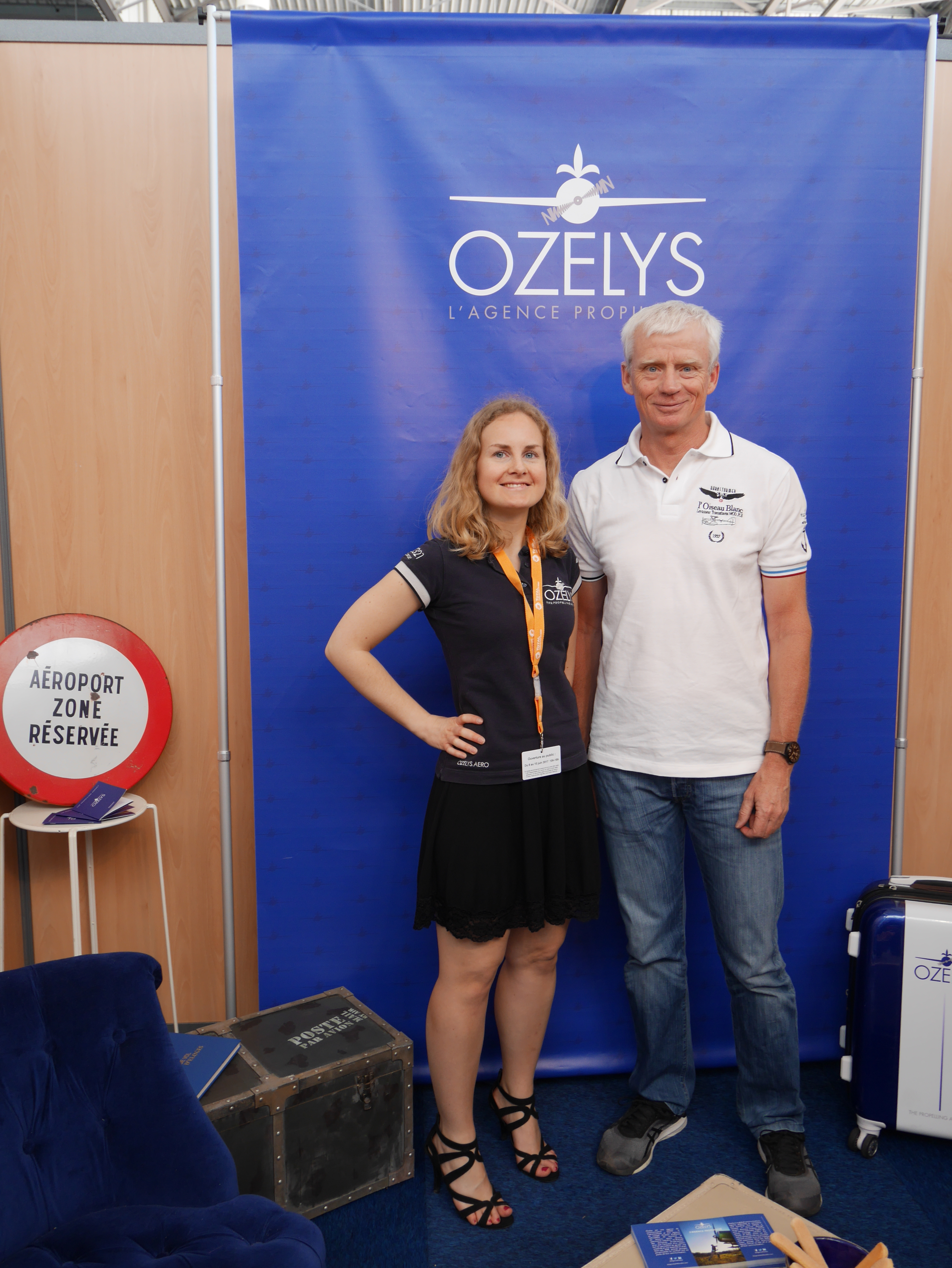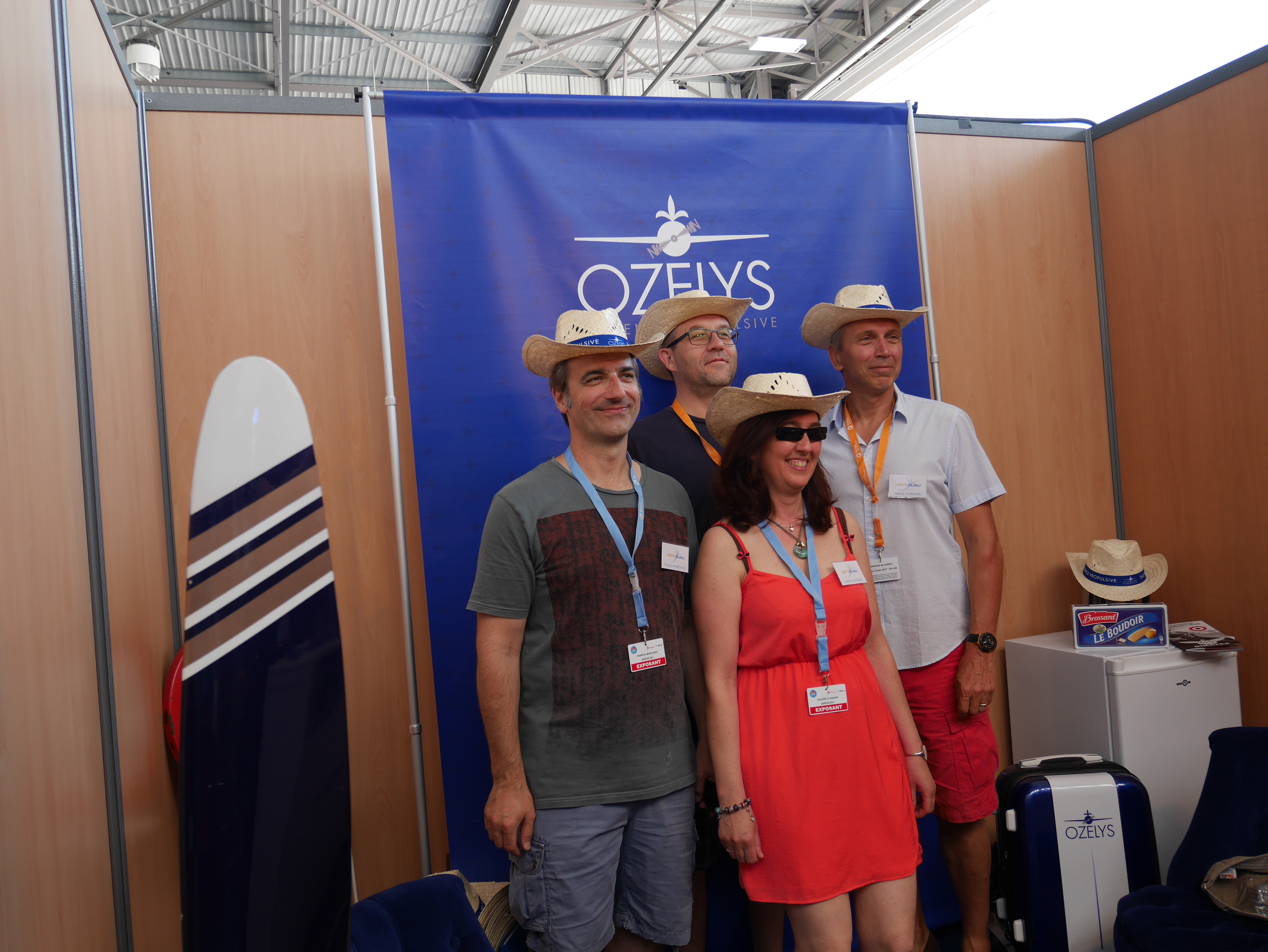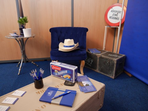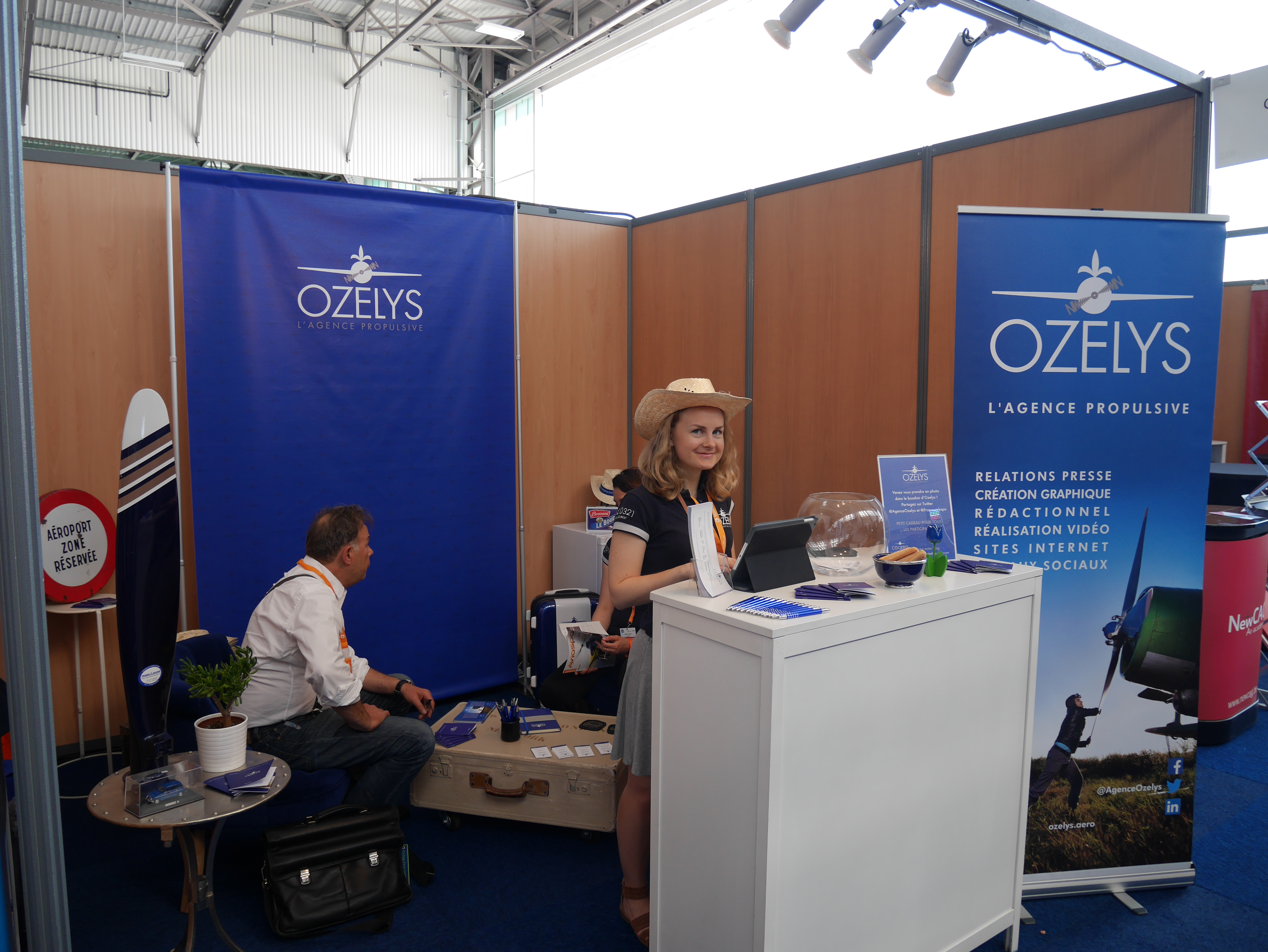 Nous avons particulièrement soigné l’ambiance de notre stand afin qu’il reflète l’univers de la marque Ozelys. Nous avions pour cela apporté un peu de notre chez nous. Du bleu Klein, beaucoup de bleu Klein. Nos fauteuils crapauds chéris, une de nos hélices, notre table basse-valise, etc. Nous étions très bien placés, dans le hangar, nouvelle surface d’exposition 2017, non loin de notre client Total.